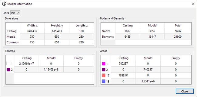 VOLUME INDICES. In addition, both the casting and the mold can be non-uniform, i.e. not all finite elements entering into them necessarily have the same properties. Thus, several materials can be used simultaneously in the molds; they can have the cores, cooling plates, etc in their composition. In it’s turn the casting being monolithic and homogeneous by the physical properties, may have the areas within itself that are distinguished, for example, by the value of the initial temperature. In order to take these differences into account in the calculation, elements with the same conditions or properties are combined into groups and assigned numbers or indices.