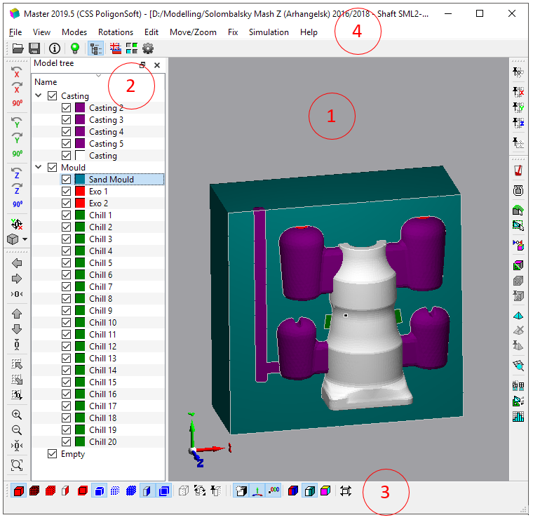 The main part of the module window (see the figure below) is occupied by the working area, where the GM is displayed (1). On the left is the Model Tree (2), which displays a list of GM volumes. The Model Tree allows you to control the visualization of the GM and set the most important parameters of the computational domain. Toolbars (3) are installed on all sides of the module window. The menu bar (4) is also installed at the top of the window.