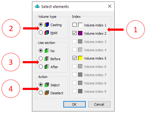 The Select Elements button opens a dialog for selecting elements by index. See Editing the indices of the elements in the arbitrary areas section for more details. |