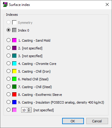 BOUNDARY INDICES. The faces of finite elements can be in different conditions: one thing is the face of an element that is on the boundary between the casting and the mold, and quite another thing is the face of an element that is on the outer boundary of the casting, i.e. between the casting and the environment. For this reason, the faces of elements that form boundaries (surfaces) with certain conditions are assigned the same index. Each specified boundary index reflects the processes that occur during the transition from one volume of the computational domain to another (most often, this is heat transfer, for example, from the casting to the mold). Indices are assigned only to the outer faces of the elements of the volumes of the Casting and Mold types, i.e. the Casting-Mold, Casting-Environment and Mold-Environment boundaries. The faces of elements that are in contact with faces of the same type (i.e. Casting-Casting and Mold-Mold) may not be specially indexed, since at the boundary of their contact, no jump of the modeled function (for example, temperature distribution) is assumed and, therefore, there is no need to specify the characteristics of the process of transition through such edges. Such edges are automatically assigned the index 0, they are not available for assigning a boundary index. How to assign boundary indices is described in the section on editing the boundary indices.