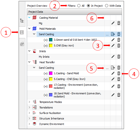 The element index (and its color) means that some condition or property (physical parameters, temperature, etc.) will be assigned to this group of elements. These conditions and properties must also be defined in the Master module by connecting the appropriate databases, templates and process conditions. For example, for volumes of the "mold" type, the index of the element always determines the its material. The properties of this material will be assigned to this volume when connected mold material properties to the model. At this stage, it is advisable to connect one of the technological process templates to the Master module in order to view ready-made sets of mold materials and determine volume indices. This is done in the Start Simulation and Parameters window on the General tab in the Mold Properties line or on the Project Overview tab in Master module window.