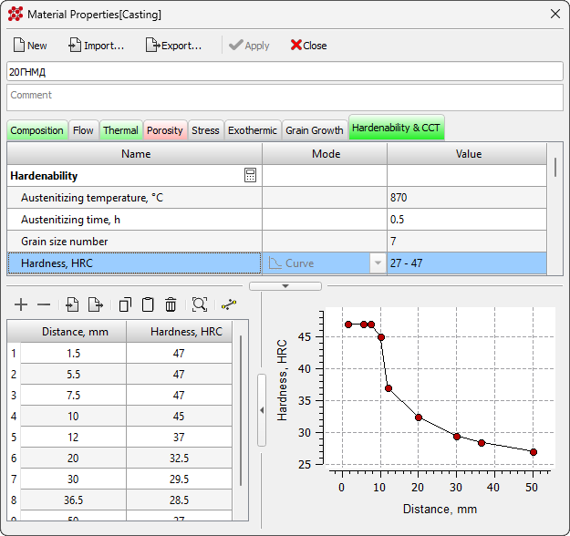 For some castings, requirements may be imposed on the quality of the macrostructure: size, shape, quantity and orientation of grains. POLIGONSOFT allows you to model the processes associated with the nucleation and growth of the grain structure of the metal (for more details, see the Macrostructure Simulation section). To create and edit boundary conditions describing the process of grain nucleation at the casting-mold boundaries, use the Surface Nucleation editor and the tree of the same name in the Project Overview panel. Nucleation conditions can be configured and used to solve one specific problem, or imported (and exported) into the project from files with the psn extension.