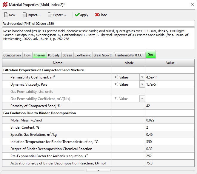 The Gas tab contains a set of properties (see the figure below) necessary for modeling the mold's gas regime. The parameters on this tab are divided into two groups. The properties in the Filtration Properties of Compacted Sand Mixture group are needed to calculate the transport of gases driven by pressure differences due to uneven temperature distribution within the mold and gas formation during binder gasification. Gasification parameters are specified in the Gas Evolution Due to Binder Decomposition group. If no characteristics are entered in the second group, the material will be considered non-gassy. The movement of gases in a non-gassy form is determined solely by their thermal expansion within the pores during mixture heating.