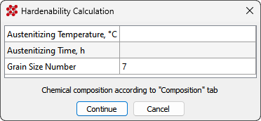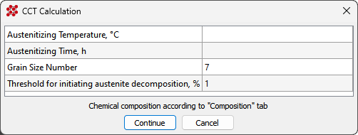 After launching the hardenability or CCT generator, you must assign the initial data for the calculation in its window. After the generator completes, the calculation results will be saved in the corresponding section (Hardenability or CCT) of the editor. The calculations are performed independently: only hardenability, only CCT, or both can be generated.