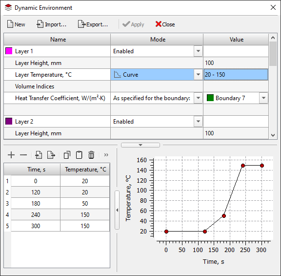 The Dynamic Environment editor is designed to create and edit an environment consisting of several layers with changing parameters. The settings can be applied to solve one specific problem or exported to a file with the pdes extension for use in other calculations (import of older files with the air extension is also supported).