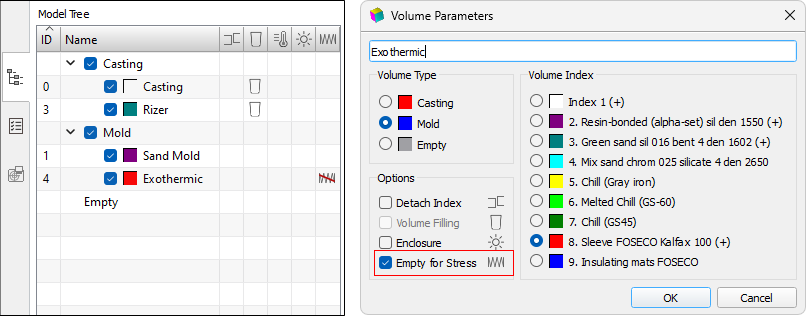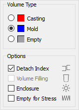 Please note that the temperature set for the volume index will be applied to all volumes with this index regardless of their type (casting or mold). Pay attention to the temperature icons in the Model Tree to avoid mistakes.