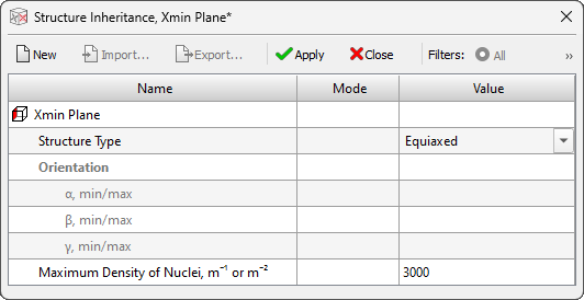 The parameters of grain structure inheritance for the selected face of the parallelepiped that limits the modeling area are specified in the table (see the figure below). In the first line of the editor, you can enter a name for the data set being created. By default, the plane identifier is used (for example, Xmin Plane in the figure below).