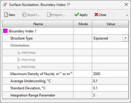 The Nucleation button opens an editor where the parameters for the nucleation of the grain structure at the casting boundaries are created and edited. See the Surface Nucleation section for more details. |
