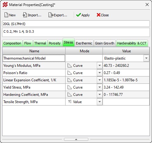 Temperature Modes editor is intended for creating and editing temperature modes of the casting and mold volumes. The settings can be applied to solve one specific problem or exported to a file with the .tel extension for use in other calculations. The ".tel" temperature file can be a part of a casting process template.