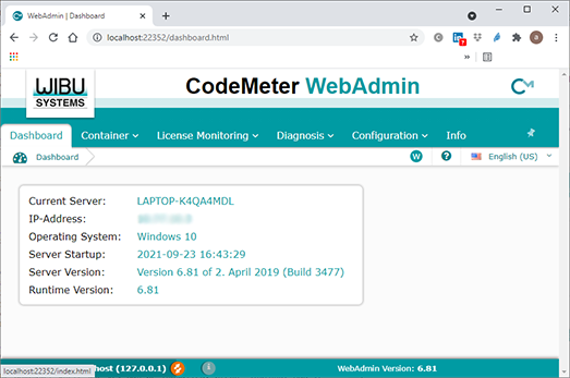 To start network access configuration to the dongle, go to the File menu and select WebAdmin. This opens the "default" Internet browser where the network interface for CodeMeter services administration is loaded (see the figure below).