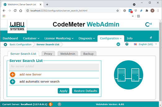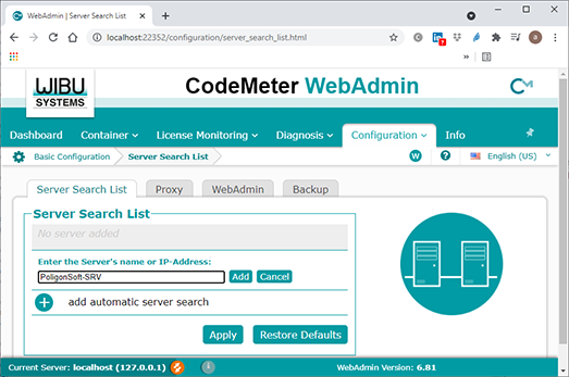 To connect on the user's side, please configure the network license as described in the Setting Up a Network License section.The external IP address of the license server should be entered, in the network administration interface of CodeMeter services (WebAdmin) in the Configuration menu, instead of the name of the local server. The IP address of the license server is reported by the POLIGONSOFT local vendor.