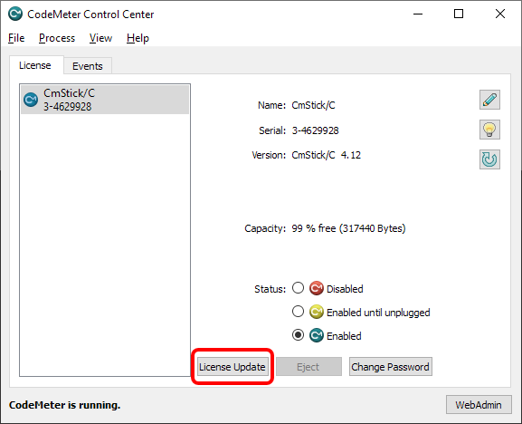 The CodeMeter license recorded in the dongle can be updated or changed. This is done through a request file that the user creates on the computer where the CodeMeter dongle driver is installed. To create a license update / change request file, follow the steps below.