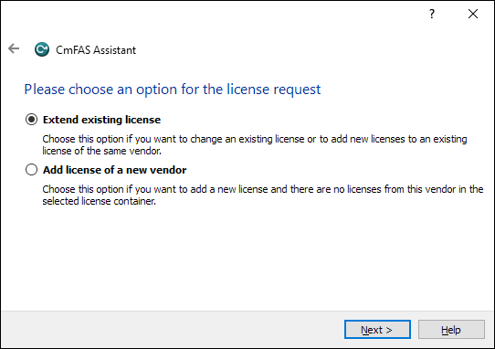 Select the Extend existing license item and click the "Next" button to go to the next step (see the figure below).