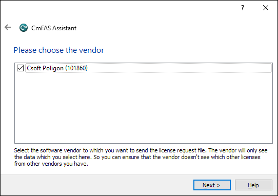Make sure that the CSoft Poligon (101860) line is checked as on figure above and click the Next button to go to the next step and specify the name of the license request file (see the figure below).
