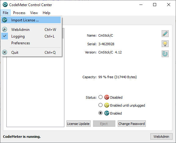 The generated xxx.WibuCmRaC file , where xxx is the dongle serial number, should be sent to the contact person from the developer or software vendor. In response, you will receive a license update file with the extension .WibuCmRaU. To update the license in the dongle, you need to launch the CodeMeter Control Center, call the Import License ... command from the File menu (see figure below). Load the received file and the license in the dongle will be updated.