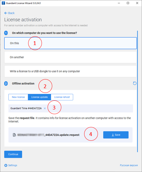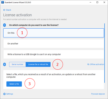 After inserting the dongle, launch the Guardant License Wizard application. This can be done via the Windows menu Start→All Programs→POLIGONSOFT xxx.x→license_wizard.exe. The application window will open (see the figure below), where you have to perform the following actions (the items correspond to the numbers in the figure):